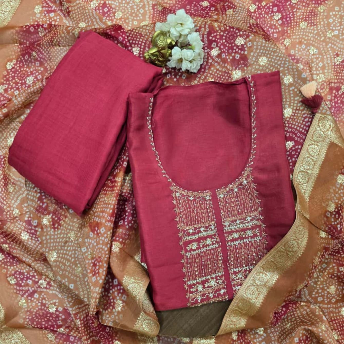 Vibrant rani pink Chanderi dress material with embroidered top, solid cotton bottom, and a stunning Bandhani-print Chanderi dupatta with zari border. Perfect for festive celebrations.
