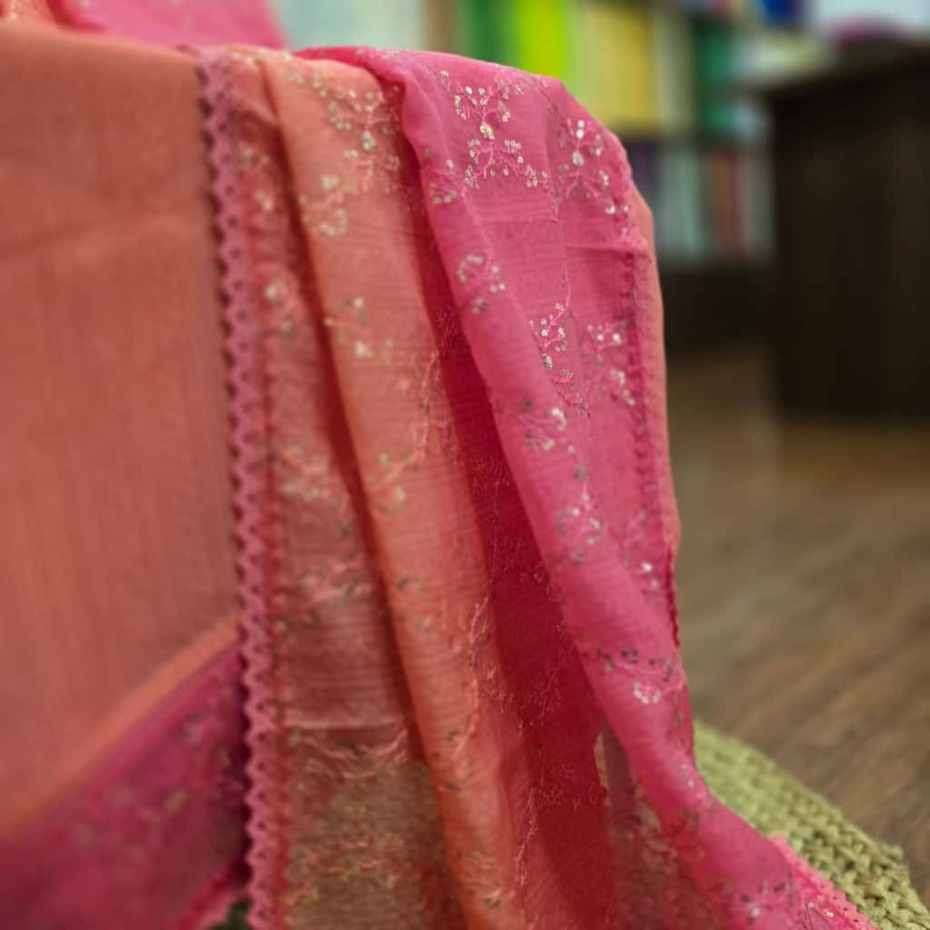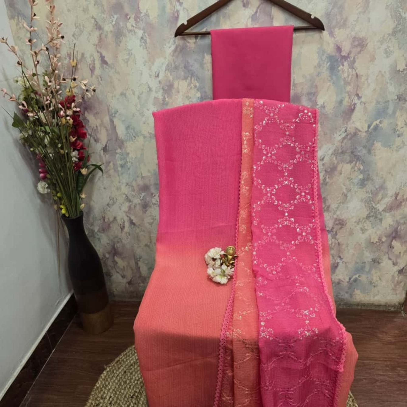 Stunning ombre viscose organza dress material in pink and orange with matching bottom fabric and sequin-embellished dupatta. Perfect for festive and special occasions.